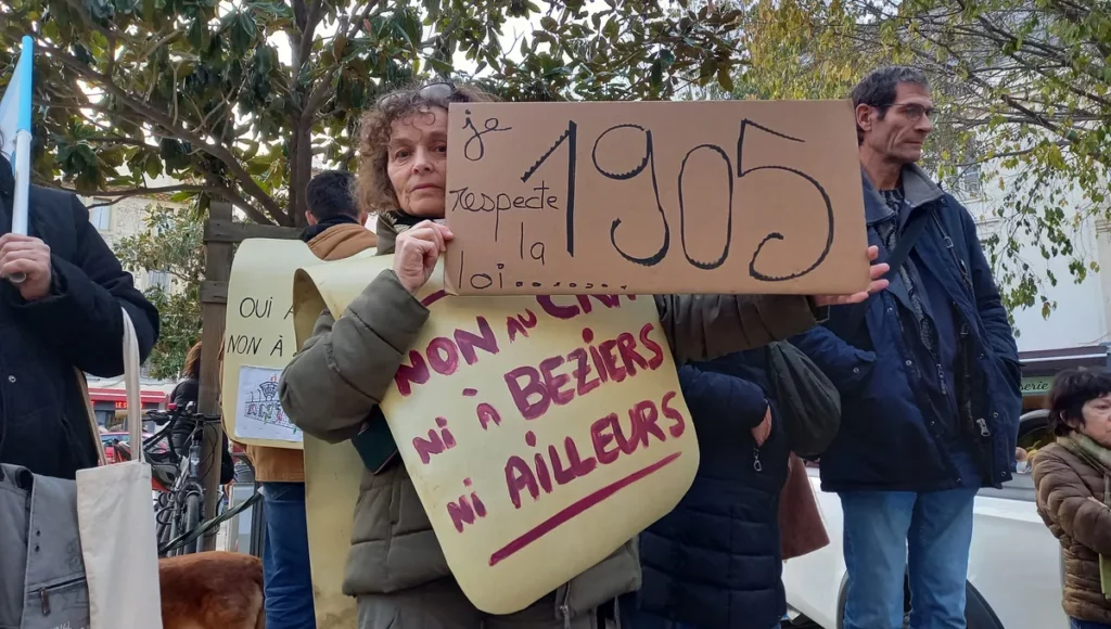 Une centaine de personnes se sont rassemblées ce samedi en fin d’après-midi en face de l’Hôtel de ville de Béziers, où le maire Robert Ménard inaugurait la désormais traditionnelle crèche de Noël dans le hall. Cette manifestation, à l’appel de la Ligue des Droits de l’Homme, de la Libre pensée 34 et de plusieurs partis de gauche et syndicats, coïncide avec les 120 ans de la loi de 1905 de séparation de l’Église et de l’État en France.