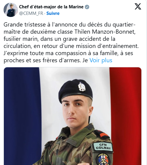 Au lendemain du dramatique accident survenu sur la RD33, dans l’Aude, la Marine nationale a confirmé l’identité du militaire décédé. Il s’agit de Thilen Manzon-Bonnet, quartier-maître de deuxième classe et fusilier marin, âgé de seulement 22 ans. Le jeune militaire a perdu la vie lundi alors qu’il revenait d’une mission d’entraînement.