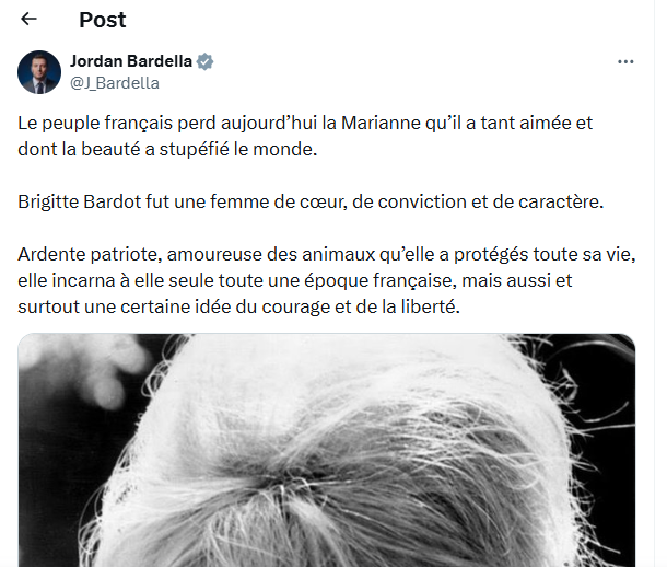 Suite à l’annonce du décès de Brigitte Bardot à l’âge de 91 ans ce dimanche 28 décembre, de nombreuses personnalités politiques ont réagi sur les réseaux sociaux.