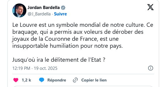 Pour le président du Rassemblement national, le cambriolage du Louvre est « une insupportable humiliation pour notre pays », a-t-il dénoncé sur X.