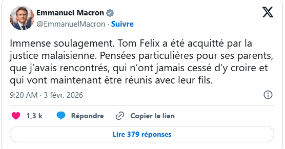 Le soulagement, après plus de 900 jours de détention. Tom Félix, un Français de 34 ans qui risquait la peine de mort en Malaisie pour détention et trafic de stupéfiants, a été acquitté et va pouvoir retrouver la liberté, a décidé un tribunal malaisien mardi 3 février. « Dans cette affaire, le tribunal n’a pas réussi à établir la preuve de la culpabilité. L’accusé est donc acquitté et libéré », a décidé la juge Evawani Farisyta Mohamma de la Haute Cour criminelle d’Alor Setar.