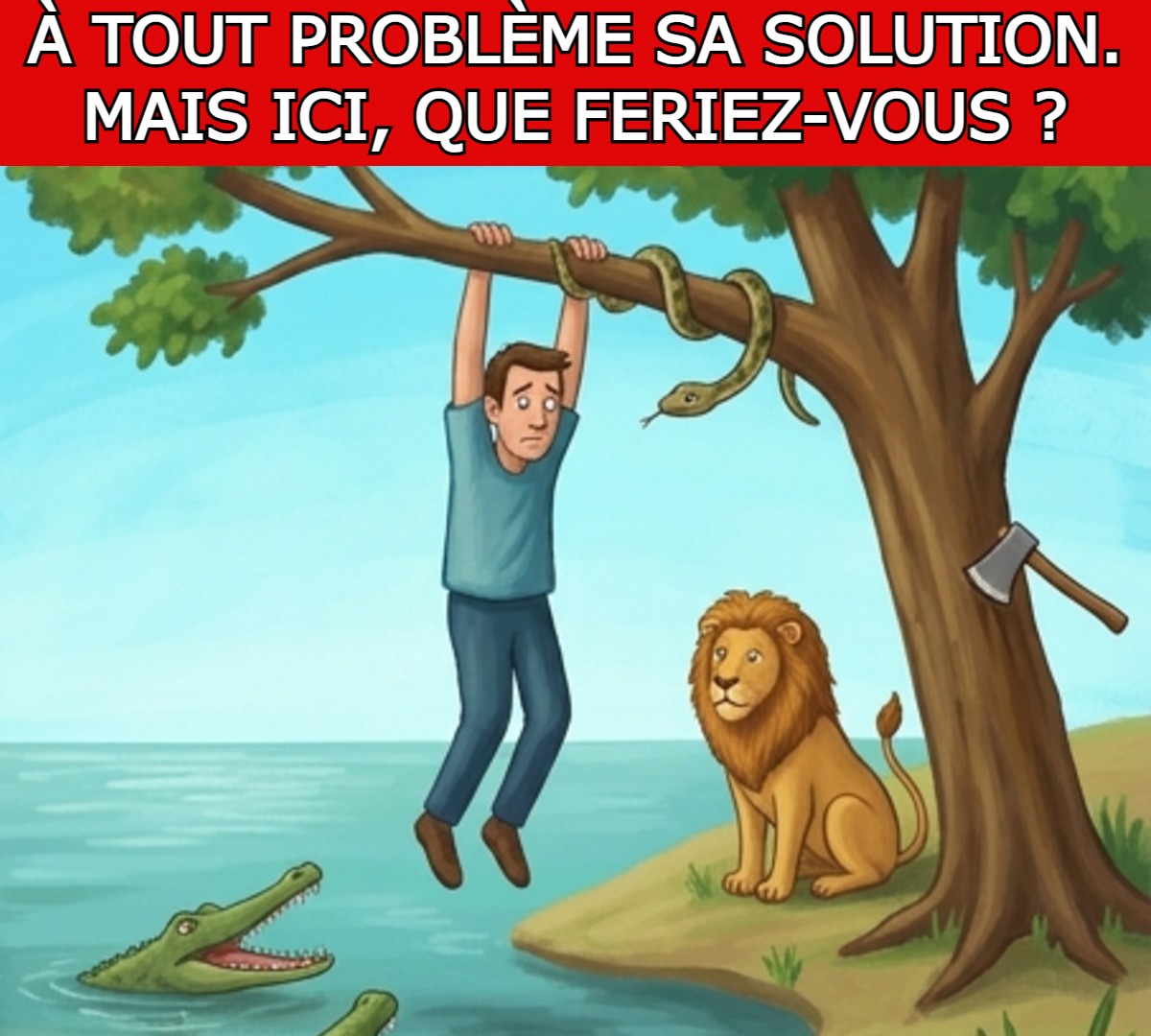 Imaginez un homme entouré d’un lion, de crocodiles, d’un serpent et d’un arbre prêt à tomber. À première vue, la situation semble totalement désespérée. On pense immédiatement qu’il doit courir, se battre ou grimper quelque part.