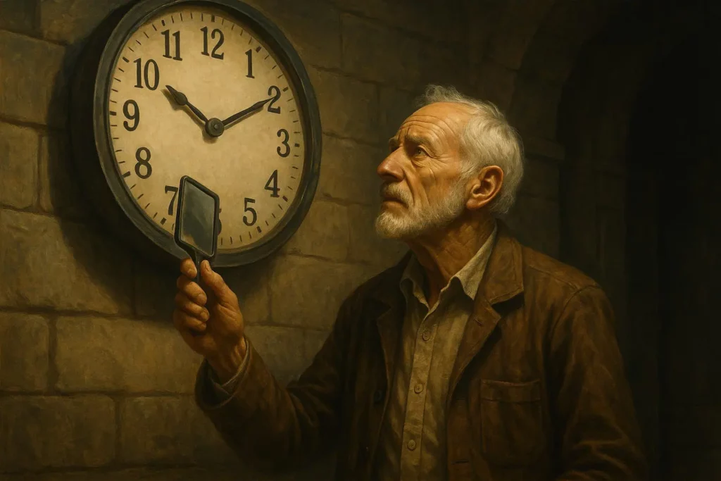 La plupart des gens cherchent une solution mécanique. Pourtant, la solution est mentale. Grâce au miroir, il lit l’heure à l’envers, calcule le décalage, puis attend que l’heure réelle corresponde à celle affichée par l’horloge bloquée.