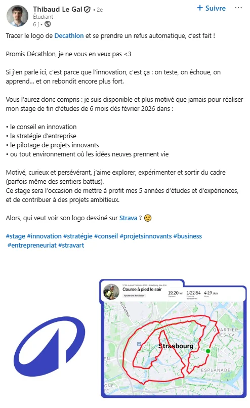 Sur LinkedIn, les idées pour sortir du lot ne manquent pas au moment de chercher un stage ou une alternance. Mais l’histoire de Thibaud Le Gal, étudiant en innovation et management de projets, a quelque chose de plus radical : candidater chez Decathlon, de la manière la plus originale. En utilisant Strava, l’application de running, il a imaginé une candidature originale de stage : tracer le nouveau logo de Decathlon à l’échelle d’un quartier entier. Mais cela ne s’est pas passé comme prévu.