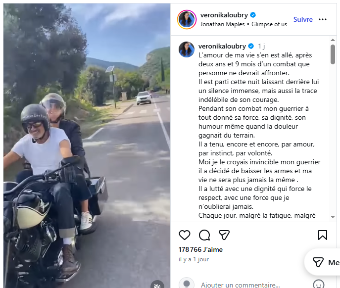 « L’amour de ma vie s’en est allé, après deux ans et 9 mois d’un combat que personne ne devrait affronter. Il est parti cette nuit laissant derrière lui un silence immense, mais aussi la trace indélébile de son courage », a réagi Véronika Loubry en légende d’une vidéo où on la voit aux côtés de celui qui partageait sa vie depuis 10 ans.
