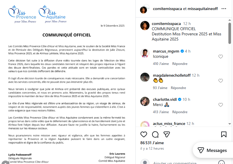 La décision, conjointement prise par les comités concernés et la Société Miss France, a été dévoilée par voie de communiqué, mardi 9 décembre 2025, sur les réseaux sociaux.