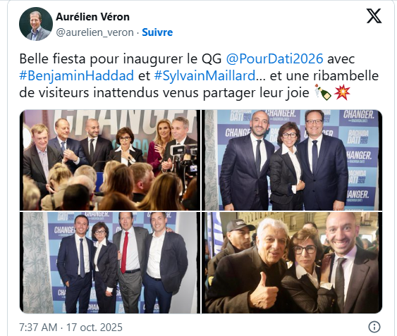 C’était une « belle fiesta » avec une « ribambelle de visiteurs inattendus ». L’élu de Paris Aurélien Véron évoque ici l’inauguration du QG de campagne de Rachida Dati, dans le XIIe arrondissement de Paris ce jeudi soir. Avec un invité étonnant : le chanteur Enrico Macias et son pouce en l’air, visible aux côtés de la candidate à la mairie de Paris.