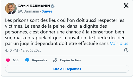 Sur le réseau social X, il a justifié sa décision : « Les prisons sont des lieux où l’on doit aussi respecter les victimes. Le sens de la peine, dans la dignité des personnes, c’est donner une chance à la réinsertion bien sûr, mais en rappelant que la privation de liberté décidée par un juge indépendant doit être effectuée sans provocation vis-à-vis de la société, vis-à-vis des victimes. Je vais faire appliquer ce bon sens partout.»