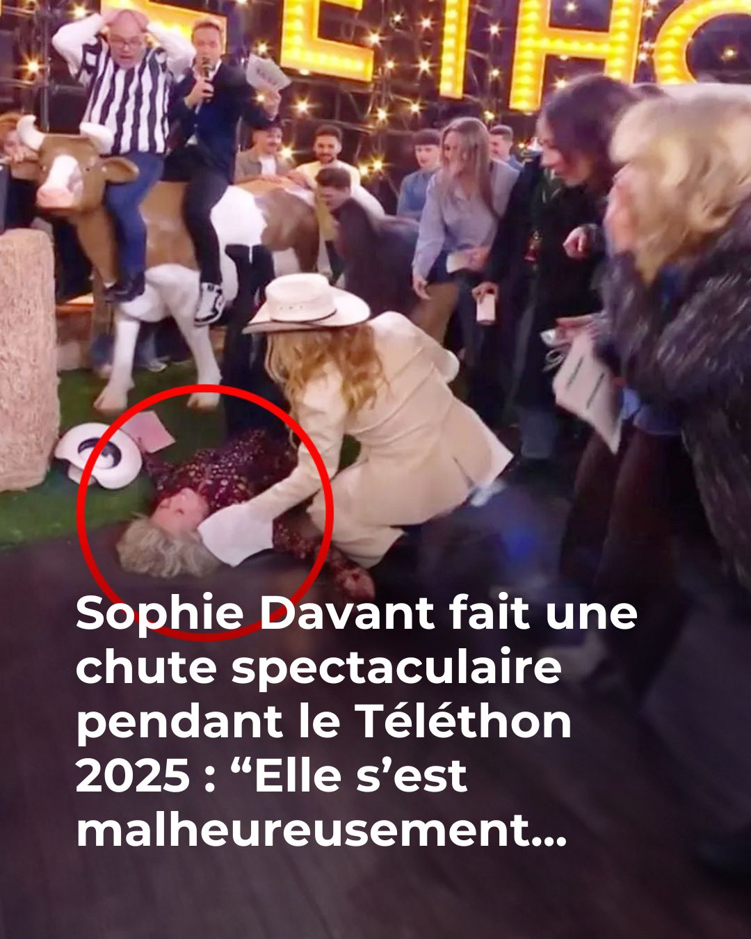 Une énergie apparemment communicative, puisque Sophie Davant a voulu en faire de même. Alors que son camarade a grimpé, accompagné, sur une vache en plastique servant de décor, elle s’est d’abord amusée : «Elle [Ladite vache, Ndlr] est en train de craquer !» «Si, si, tu peux venir. Viens-là Sophie», l’encourage Cyril Féraud. Après un moment d’hésitation, elle tente tout de même l’expérience. «Allez Sophie !» peut-on entendre, alors qu’elle se trouve hors caméra. Mais c’est la chute ! On peut alors voir l’animatrice tomber et atterrir les quatre fers en l’air. Et son chapeau de cow-boy, qu’elle arborait fièrement, de lui échapper. Avec un rire, blottie dans les bras réconfortants de Santa, Sophie Davant s’amuse : «On n’est pas à ça près . J’ai mal aux fesses !» Professionnelle jusqu’au bout, elle reprend ses esprits et enchaîne avec l’annonce suivante, celle d’«habitués du Téléthon qui vont réinventer l’art du cirque… Comme moi !» «Magnifique transition», la félicite la chanteuse, «tout était fait exprès.» Pourtant, n’est pas équilibriste qui veut…