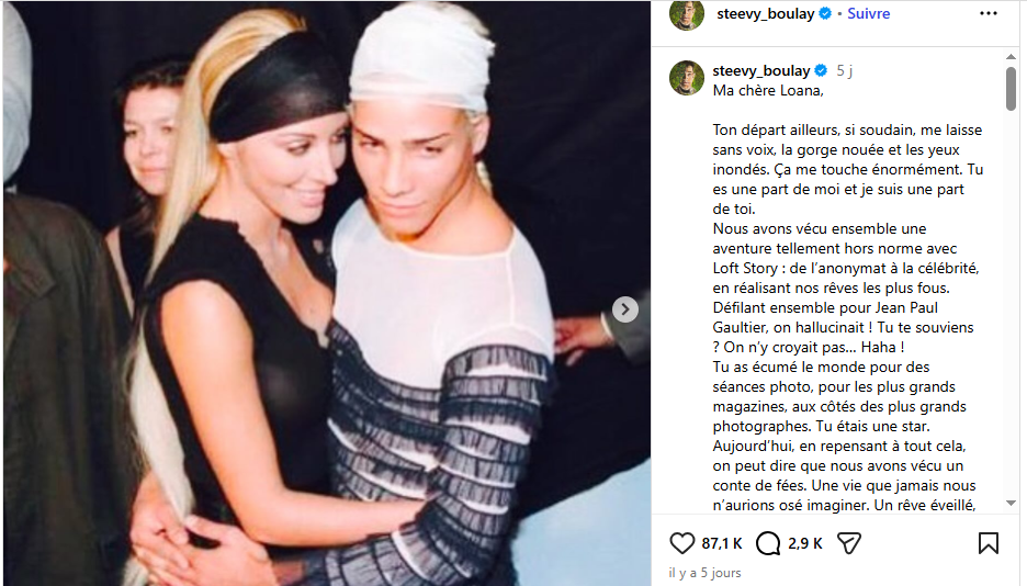 « Défilant ensemble pour Jean Paul Gaultier, on hallucinait ! Tu te souviens ? On n’y croyait pas… Haha ! Tu as écumé le monde pour des séances photo, pour les plus grands magazines, aux côtés des plus grands photographes. Tu étais une star. Aujourd’hui, en repensant à tout cela, on peut dire que nous avons vécu un conte de fées. Une vie que jamais nous n’aurions osé imaginer. Un rêve éveillé, intense. Et puis, je t’ai vue tomber, te redresser, te battre, lutter, céder… », s’est ensuite remémoré l’ancien candidat de Loft Story. Tout en publiant deux clichés de Loana à ses côtés, pris à plusieurs années d’intervalle. « Tu as tout donné, jusqu’au bout. Le temps est au repos, maintenant. Je te laisse rejoindre le firmament. Mon cœur, lui, reste lourd, définitivement marqué par toi, Loana. Ton ami, pour toujours. Steevy », a finalement conclu le sociétaire des Grosses Têtes.