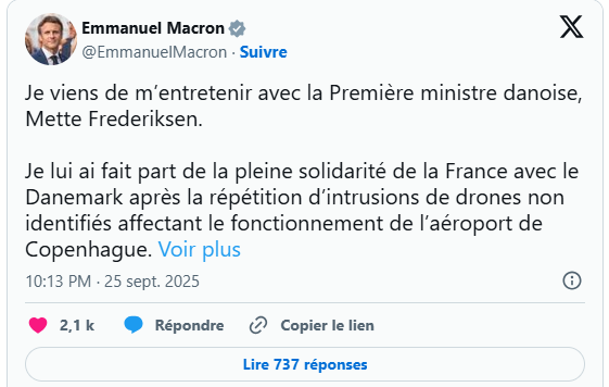 « Je viens de m’entretenir avec la Première ministre danoise, Mette Frederiksen. Je lui ai fait part de la pleine solidarité de la France avec le Danemark après la répétition d’intrusions de drones non identifiés affectant le fonctionnement de l’aéroport de Copenhague », a écrit le président français sur X. Le chef de l’État a ajouté que la France était prête à « évaluer la situation et contribuer à la sécurité de l’espace aérien danois ».